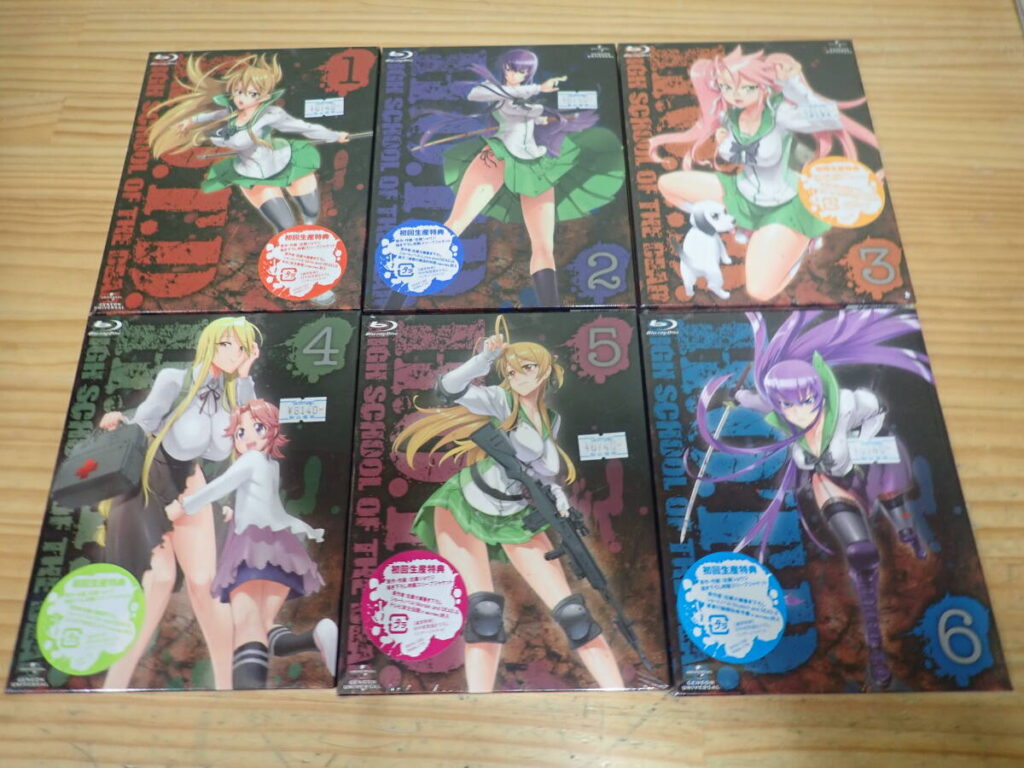 「学園黙示録 HIGHSCHOOL OF THE DEAD 全6巻 Blu-ray」は、ゾンビ×学園×サバイバルという独特の世界観で今も根強いファンが多い作品です。全巻揃っていて、保存状態が良好であれば高額査定も十分に狙えるタイトルです。